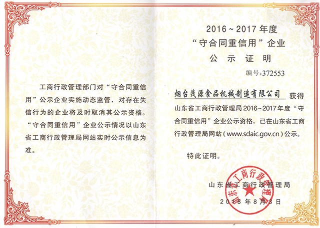 熱烈慶祝煙臺茂源食品機械制造有限公司獲得2016-2017年度“守合同重信譽”榮譽證書