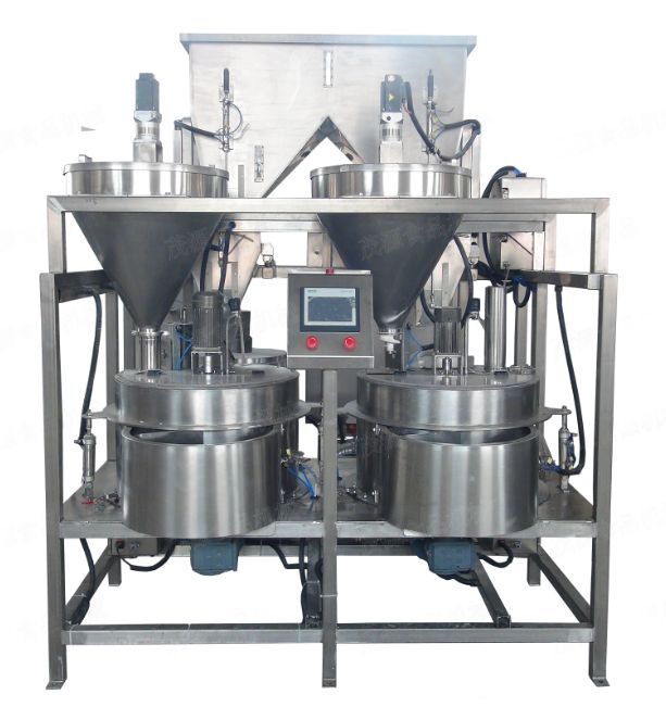 裹衣原料儲存在料斗中,由PLC控制自動出料,通過稱重料斗自動稱重,原料自動投入到裹衣桶中,通過裹衣桶旋轉盤帶動原料進行運轉,料液通過容積泵和高速甩液盤將料液均勻涂灑到原料表面,粉料通過自動定量給粉系統投入到裹衣桶中,實現一次裹粉作業過程,循環的次數取決于產品工藝參數要求,可設定不同裹衣次數,以實現不同裹衣產品。全裹衣過程準確控制每次投入的粉劑和料液,以便達到每次裹衣的一致性。