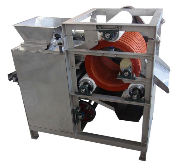 將經(jīng)浸泡的蠶豆倒入料斗,經(jīng)震動(dòng)進(jìn)料使原料進(jìn)入由三個(gè)動(dòng)力輥固定的旋轉(zhuǎn)膠輪之間的夾縫,在進(jìn)料輪的作用下,經(jīng)過刀片將原料外皮切口,然后由出料輪排出。